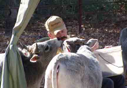 Here, Mike is sitting in a chair with a bucket of feed. Being curious, all the girls want to see what he has brought them. |